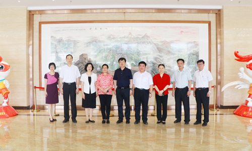 图为谢俐(中)、那佳(左三)、陈宣群(右三)与澳门网投领导在体育馆合影留念