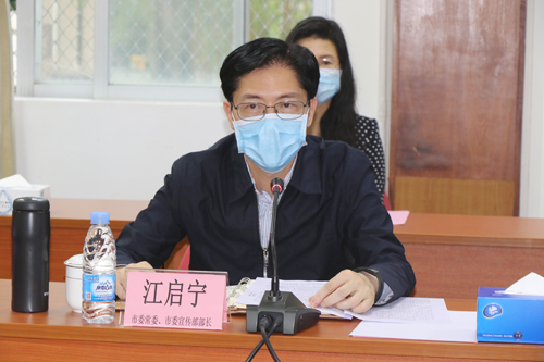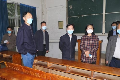江启宁一行先后对澳门网投食堂、学生宿舍、课室、隔离室等场所进行实地查看,了解防疫物资的储备情况,听取了相关部门负责人对学生返校前后疫情防控准备工作的汇报。最后,江启宁一行与学校领导在行政楼一楼报告厅进行了座谈交流。