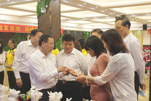 图为和飞、高秀、陈广俊、邹云容、莫秀全、王寒里(依次从左到右)共同按动启动球