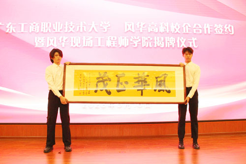 莫秀全为风华现场工程师学院题词“风华正茂”,寓意学院像青年大学生一样朝气蓬勃、奋发有为。风华高科还将设立风华奖学金,每年向学生提供十万元专项资助,鼓励学生学业发展、科技创新。