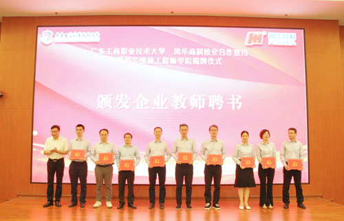 和飞为风华现场工程师学院院长曹秀华颁发聘书并致辞,他回顾了澳门网投唯一官网与风华高科校企合作洽谈历程,称双方建立了合作最深入、效率最高速、内容最广泛的校企合作模式,提出加强合作共建电子信息类等专业、共同开发课程资源、打造双师团队、强化社会服务等四方面的重点合作任务,力争打造最受企业欢迎、最受政府认可、最有益学生发展、产教深度融合的现场工程师学院。