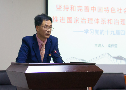 本网讯 12月10日下午,学校党委在行政楼一楼报告厅组织举行党的十九届四中全会宣讲,由思政部党支部书记梁伟莹主讲,讲座主题为《坚持和完善中国特色社会主义制度,推进和提高治理能力现代化》。学校教职工党员和党支部党务小组学生参加,党委宣传部部长韩治国主持。