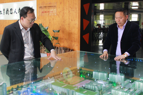 图为丁孝鹏(右)向林晓东(左)介绍大旺校区规划模型