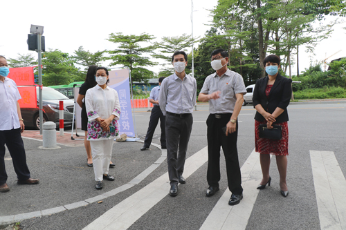 图为李剑(中)一行在谢建平(左二)、叶峥嵘(右二)的陪同下考察校门片区