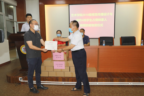 陈敬联代表学校接受防疫物资,并向谢翔总经理颁发捐赠证书,对占倩妹家人赠送义举表示衷心的感谢。