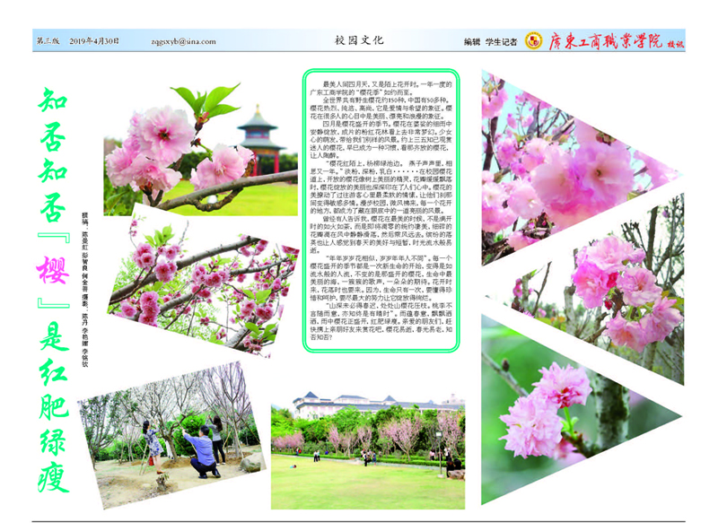 本网讯 近日,由广东高校校报研究会主办的“2019年度广东高校校报好新闻评选”结果揭晓,澳门网投共有三项作品获奖,其中,学子杨璇杏设计的“澳门网投唯一官网校讯2019年第七期第三版”获得版面类二等奖;韩治国老师撰写的《澳门网投唯一官网获批》 获得消息类三等奖;学子陈曼虹、彭智良、何金善撰写的《知否知否,“樱”是绿肥红瘦》获得标题类三等奖。(供稿:宣传部)