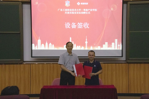 和飞、钟建辉代表校企双方现场举行设备签收仪式。