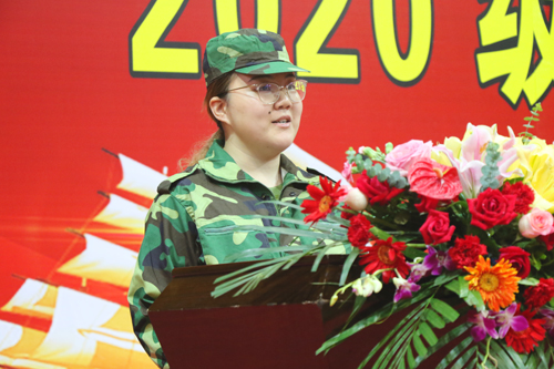 商学院2020级学子梁楚莹代表新生发言。她表示全体新生将在军训期间团结一心、服从命令、听从指挥,养成尊师守纪的班级作风,用奋勇拼搏的汗水完成此次军训任务,将自己磨练成一个合格的工商学子。