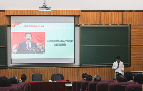 叶峥嵘报告的题目是《深入贯彻十九届五中全会精神,写好学校高质量发展奋进之笔》。报告从全面准确把握五中全会精神、准确研判当前教育事业面临的形势任务、围绕高质量发展,全面抓好五中全会精神的贯彻落实等三个方面对十九届五中全会精神进行了辅导讲授。叶峥嵘指出,要深刻领会总书记在五中全会重要讲话精神,准确把握2035年国家远景目标和“十四五”时期我国发展的指导方针、主要目标、重点任务,提出要特别把握好“六个新”,“12大举措”等新内容、新提法,要求提高认识新形势、新阶段、新理念、新格局、新要求等思想自觉和行动自觉,全力促进学校发展。