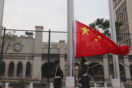 升旗仪式开始,国旗护卫队迈着整齐的步伐,以饱满的精神护送五星红旗入场。随后,升国旗奏唱国歌,全体师生肃立,行注目礼。