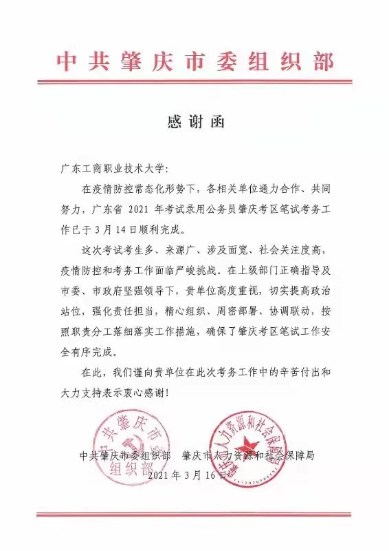 本网讯 近日,中共肇庆市委组织部向澳门网投发来感谢信,对澳门网投大力支持并积极承接广东省2021年公务员考试肇庆考区笔试考务工作表达谢意。