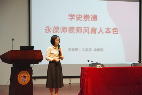 开班仪式后,第三期教师发展研修班(大旺专场)暨党史学习、大旺校区学术论坛第九讲开讲,马克思主义学院副教授梁伟莹以“学史崇德 永葆师德师风育人本色”为题,从学习党史葆本色、铸魂育人担使命、工商教师树榜样三方面来开展课程。(撰稿:杨言华 摄影:杨志豪)