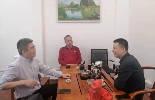 图为龙辉驰副院长(右一)拜访肇庆鸿大投资管理有限公司张仲斌董事长(左一)