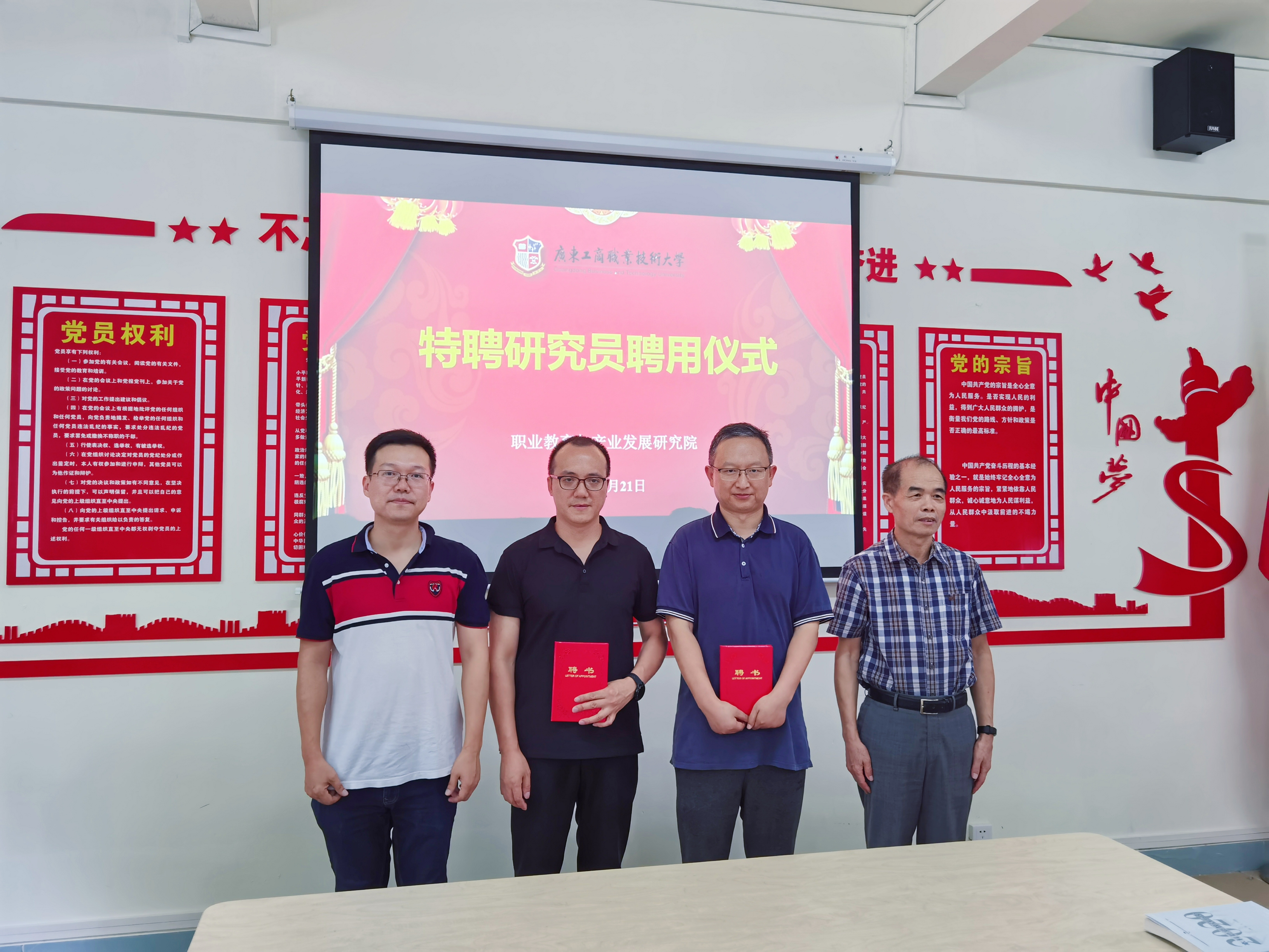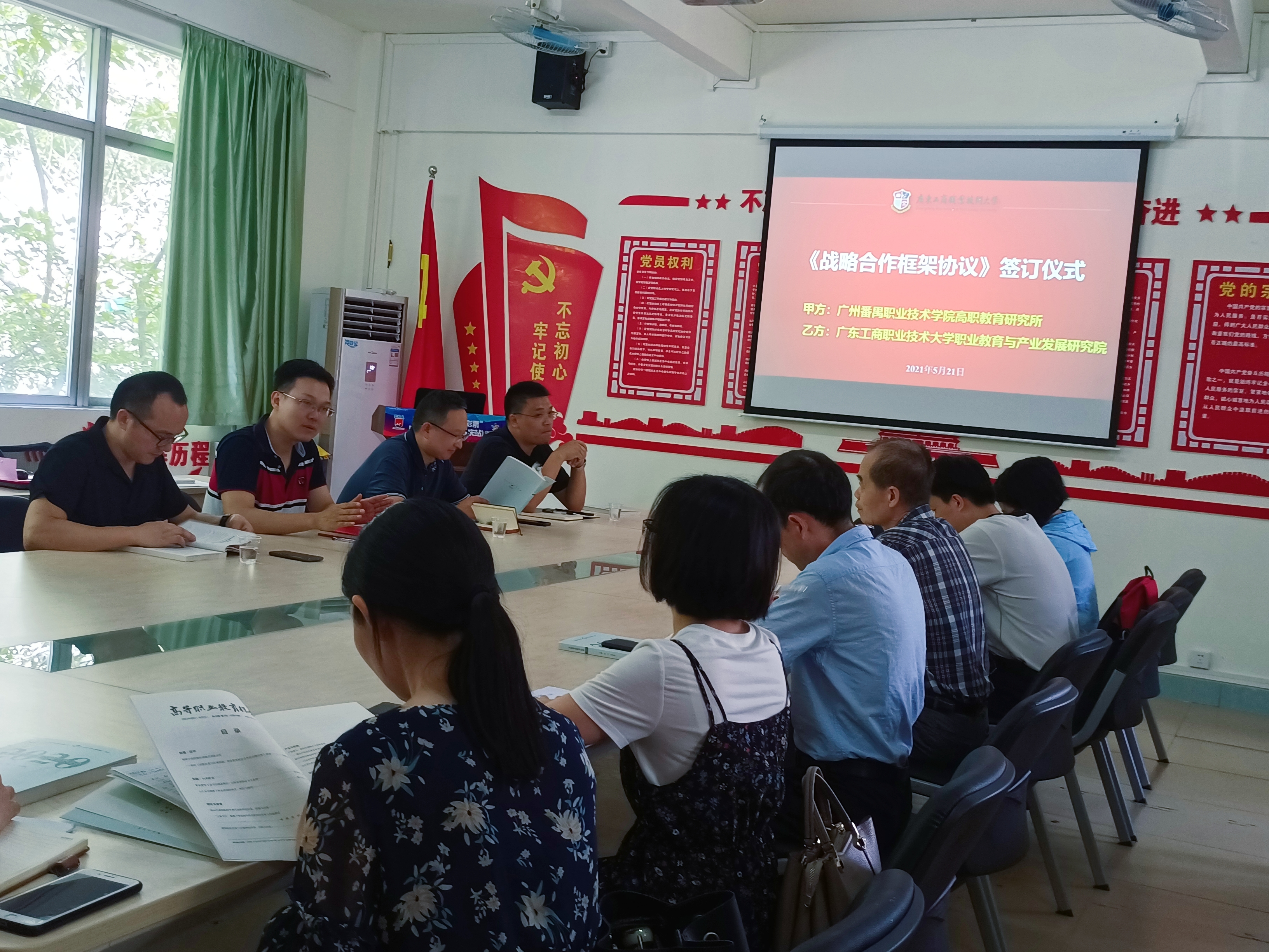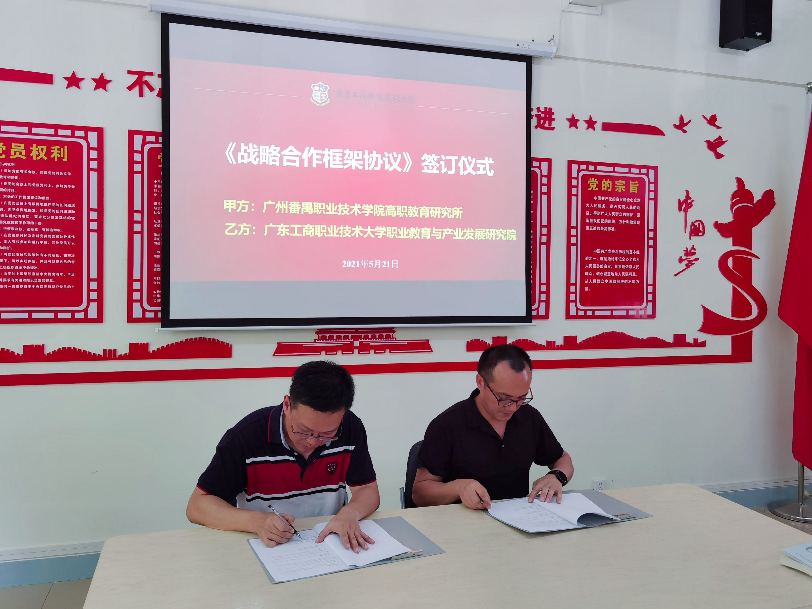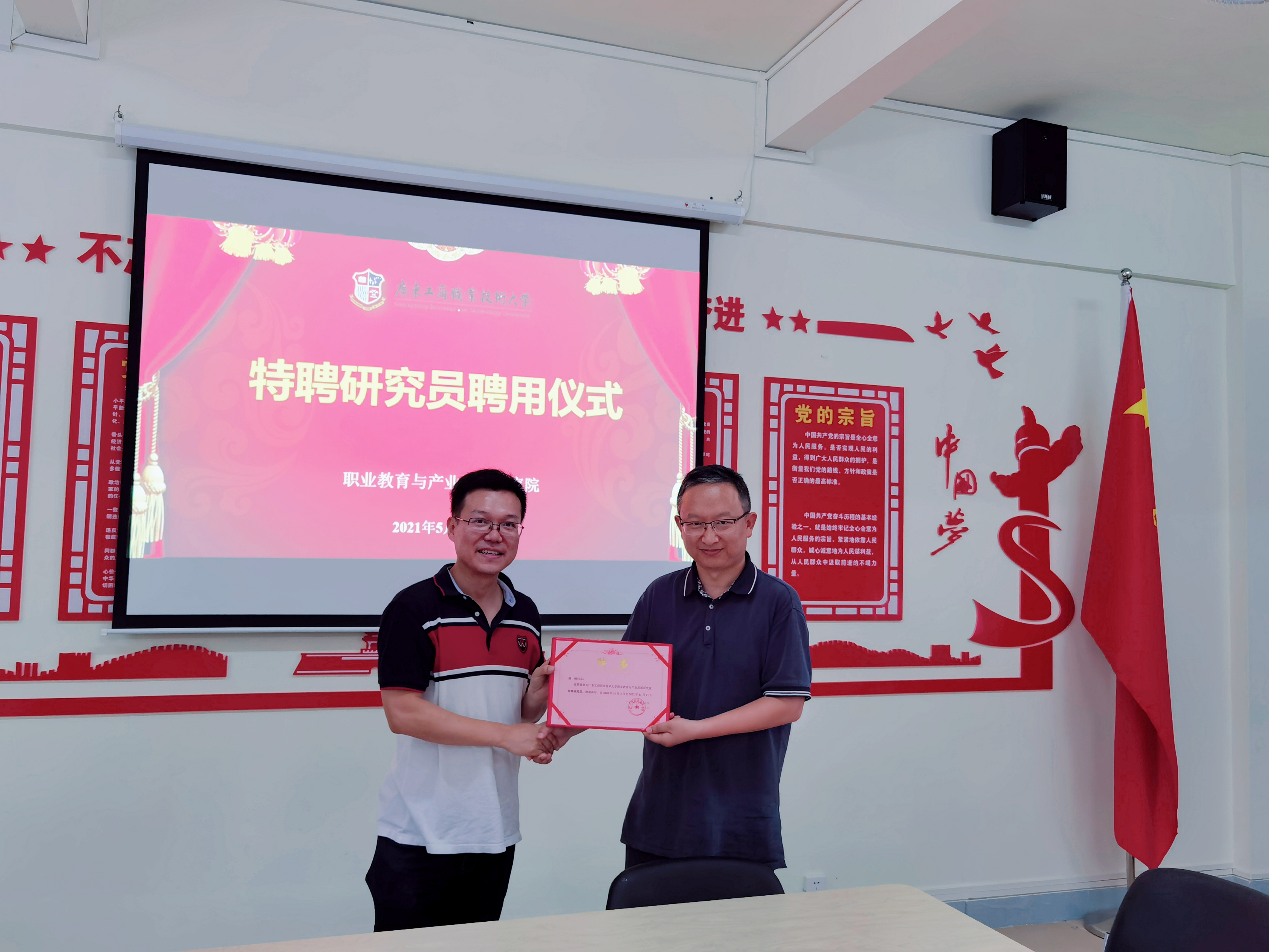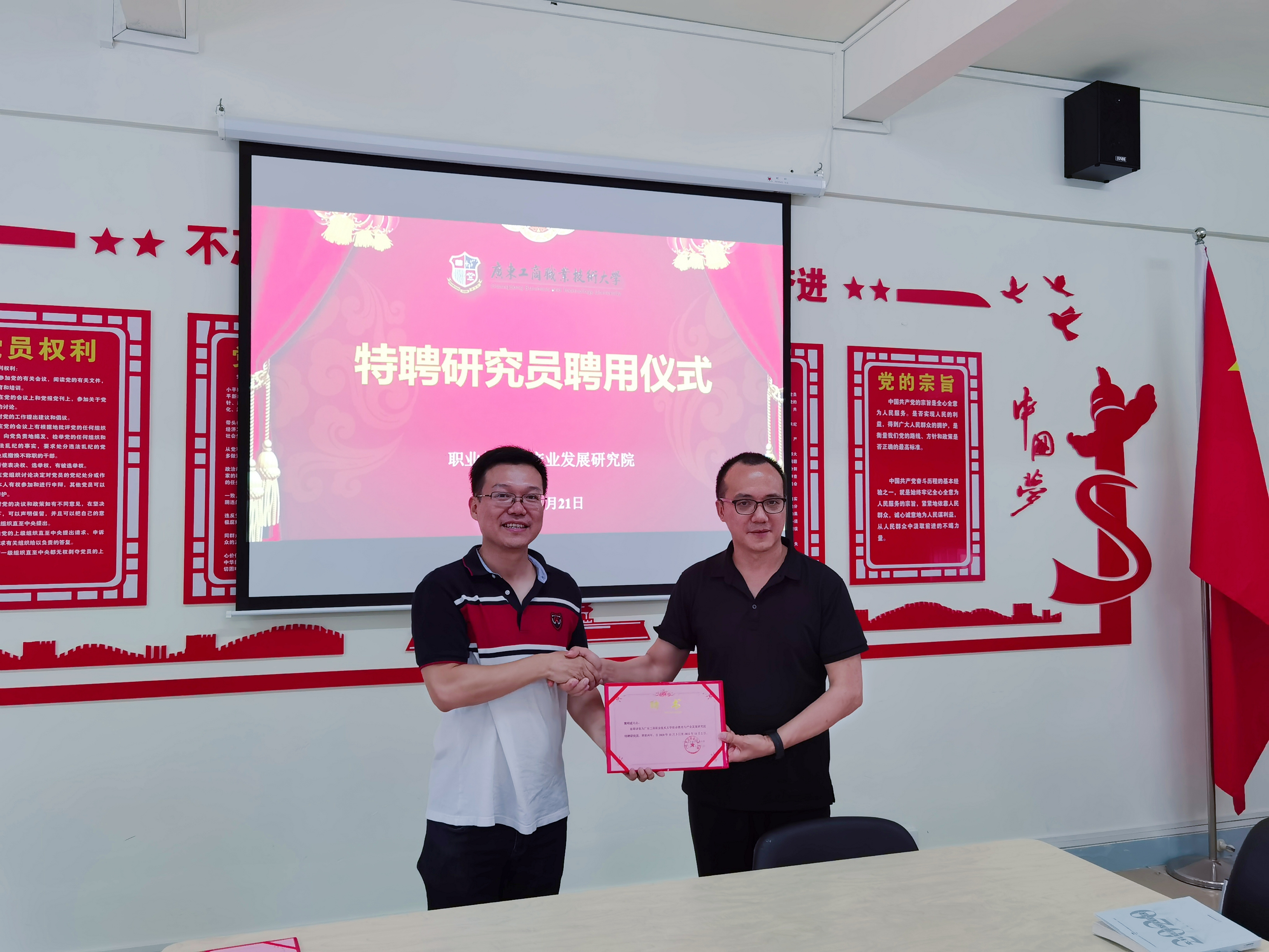 会议伊始,澳门网投职业教育与产业发展研究院与广州番禺职业技术学院高职教育研究所签订《战略合作框架协议》。会议强调,双方通过建立战略合作关系,实现优势互补,协同发展,繁荣职业教育学术研究,推动职业教育改革实践。双方表示,日后将逐步扩展和深化双方多领域、多层面的合作,积极探索多元化的合作模式,建立良好的工作机制,并稳步推进和落实合作事宜。紧接着,方校长为校外特聘研究员樊明成、赵锋颁发聘书并合影。会议指出,特聘研究员要按照澳门网投特聘研究员管理办法的规定和要求,认真履行岗位职责,高质量完成聘期研究任务。