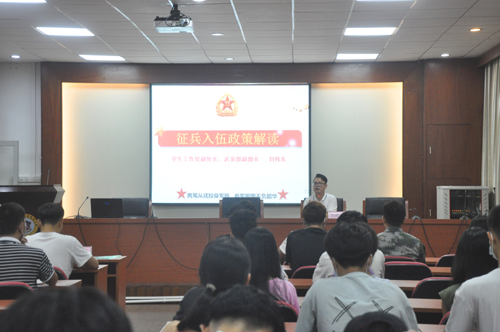 本网讯 根据国家对大学生入伍的新政策,鼓励大学生积极参军入伍,6月23日晚,澳门网投在行政楼一楼报告厅举行2021年秋季征兵入伍政策宣讲会,学生工作处副处长刘伟东,爱尔眼科屈光科主治医师李春光,学生工作处有关工作人员、退役学生代表和意愿应征入伍的学生代表参加宣讲会。