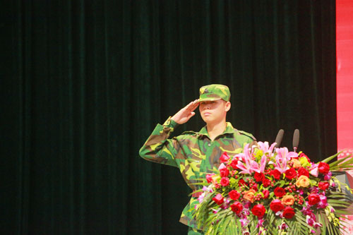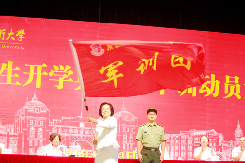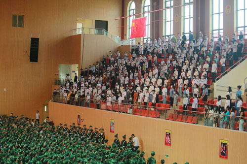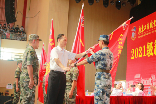 谢建平为军训师授团旗,学校武装部副部长刘伟东接旗。和飞为各军训营授营旗。
