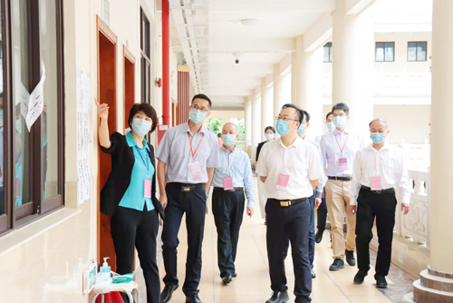 图为周昭忠(前右一)、王军(前左一)等巡视考场