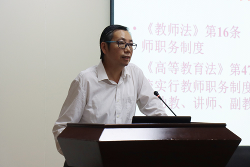 文川从教育法原理、教育基本制度、高等学校应依法治校、教师应依法执教、学生应受教育管理与权益保护五个方面,结合社会案例和个人看法展开讲述。他从教育法出发延展到高校法律责任,给教师们普及了教育法知识,并简述了教育基本制度。他强调高校和教师们应遵循权利与义务相统一的原则,高校应加强内部管理,明确高校与各个对象法律关系的基本特征,教师们要明确权益的法律保护与救济,正确地行使教师的权利。高校应将管理法治化,加强学生权利的保护。