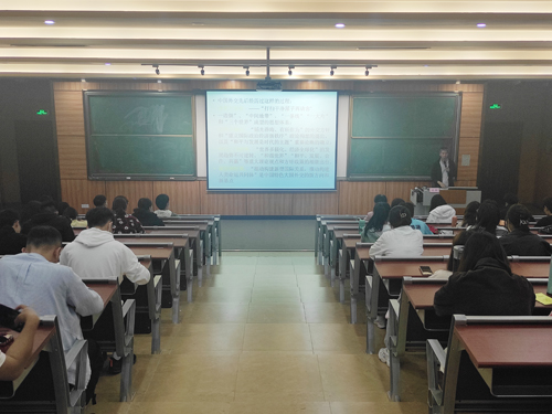 本网讯 11月17日下午,澳门网投明德大讲堂第五十期讲座在致知楼113课室举行,艺术学院张斌教授担任主讲人,讲课主题为《中国外交的中华传统文化元素》,建筑工程学院学生代表约100人参加了本次讲座。