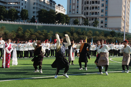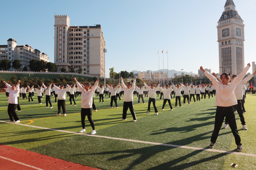 随后,各学院的学生代表表演大型歌舞《多彩活力健身操》,西藏林芝职业技术学校访学学子表演西藏特色民族舞蹈。青春活力的舞姿、和谐优美的动作博得全场热烈欢呼,引发全场阵阵掌声,全面展示了澳门网投学子的蓬勃的青春活力和昂扬的精神风貌。