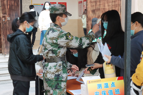 图为工作人员为考生检测体温和检查粤康码