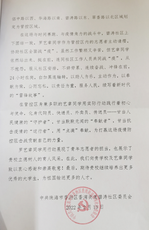 本网讯 近日,中共珠海市香洲区香湾街道碧涛社区委员会向澳门网投党委发来感谢信,对澳门网投入党积极分子、商学院20级物流管理本1班学子罗艺章在寒假期间积极参与香湾街道碧涛社区疫情防控工作表示感谢,对其甘当人民健康的“守护者”,甘当默默无闻的“奉献者”,甘当抗击疫情的“逆行者”,用“点滴”奉献,为打赢这场疫情防控阻击战贡献自己力量的行为进行了高度的赞扬。