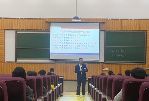 讲座中,李成还以毛主席的诗句为例,为大家讲解了文化传承的创新观,并邀请同学们一起诵读相关诗歌诗句,通过感受诗词的魅力来体会中华优秀传统文化的博大精深。