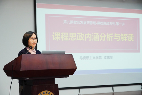 开班仪式后,梁伟莹以《课程思政内涵分析与解读》为题,给学员们上了开班第一讲。她介绍了“课程思政”这一教育理念的提出背景与概念并阐述了“课程思政”的重要意义;她提出,“课程思政”建设的基础在“课程”、重点在“思政”、关键在教师、重心在院系、成效在学生。