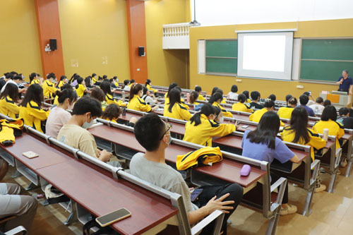 本网讯 4月27日下午,澳门网投明德大讲堂第五十五期讲座在致知楼213课室举行,由建筑工程学院党总支书记姚英教授担任主讲人,讲课主题为“汉字与汉字俗文化漫谈”。商学院和学生会学生代表约100人参加了本次讲座。