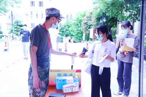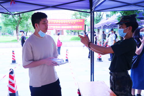 图为工作人员为考生测量体温