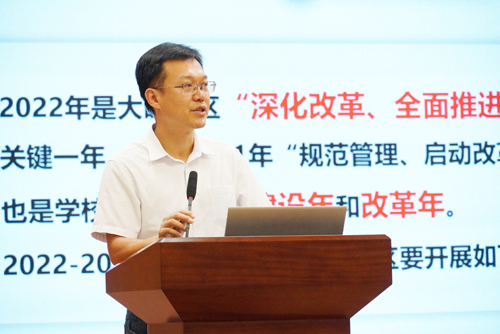 方泽强作新学期工作部署。他提到2022年是大旺校区“深化改革、全面推进领航行动计划”的关键一年,是继2021年“规范管理、启动改革”后的重大发展年份,也是学校的评估年、建设年和改革年。为进一步明确工作方向,圆满完成今年的工作任务,他对大旺校区本学期的工作作出如下部署:第一,做好迎新系列工作;第二,卓有成效地开好两个会;第三,推进教学改革和督导体系建设;第四,针对人与事这两大问题下重手抓成效;第五,做好疫情防控和学生服务管理工作;第六,抓好社会培训工作;第七,提高行政办公效率、提升后勤服务水平、做好信息化服务建设等。