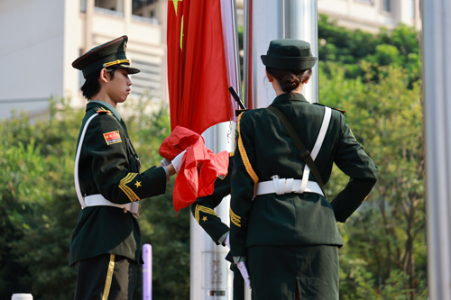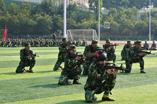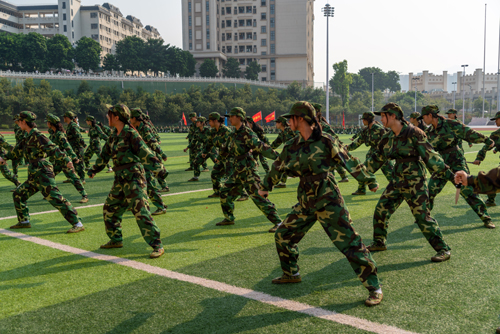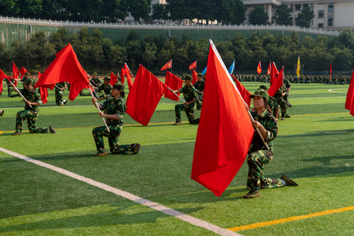 在激昂的进行曲中,各授阅方阵依次通过主席台,他们步调一致、身姿矫健、口号雄浑敦厚,展现了广工商大学子意气风发、报效祖国的精神风貌。各学院方阵排列整齐,有序地进行“舞战旗”、“女子匕首操”、“旗语操”、“擒敌拳”、“手语操”等表演。