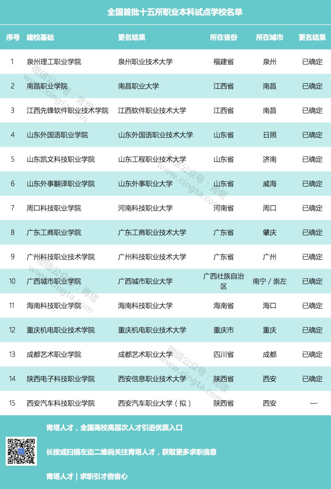 另有15所职业学院更名的情况备受关注。来自各大高校的官方消息,2018年12月,教育部致函各地政府,明确15所职业学院升格为本科层次职业学校,开展本科层次职业教育试点,并将在2019年5月经过地方政府层面测评指导后,批准更名为“职业大学”。