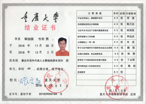 韩治国赴重庆大学参加肇庆市党外代表人士暨统战部长培训班学习