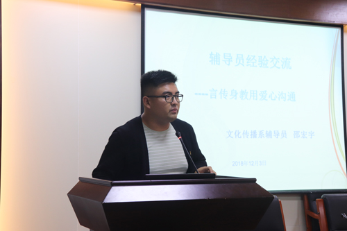 首先,由计算机应用技术系王海燕、财会系罗杰齐、应用外语系倪东梅,文化传播系邵宏宇等四名优秀辅导员依次上台分享常规工作、学生日常管理、学生思想政治教育等方面工作经验和方法。王海燕提出对常规工作要分门别类、规范记录学生的数据,强调学生的第一手资料对工作重要性;罗杰齐分享了她的工作理念:尊重学生、理解学生、教育为主、惩罚为辅,创新班级管理方法;倪东梅讲述了从事辅导员工作后的心路历程以及变化,从不适应到热爱,态度决定一切,并分享了开展活动、班级建设、培养学生干部的工作小方法;邵宏宇从四方面分享了工作经验:拉进距离,取得信任,树立威信;细微着手,亲身践行,发挥纽带作用;坚持“尊重、理解、包容”,让问题轻松化;关注素质发展,统筹兼顾,以促教学相长。