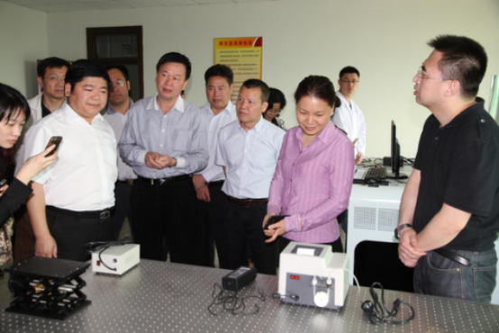 图为肇庆市陈宣群副市长(右二)在科技园区光电公共实验室参观